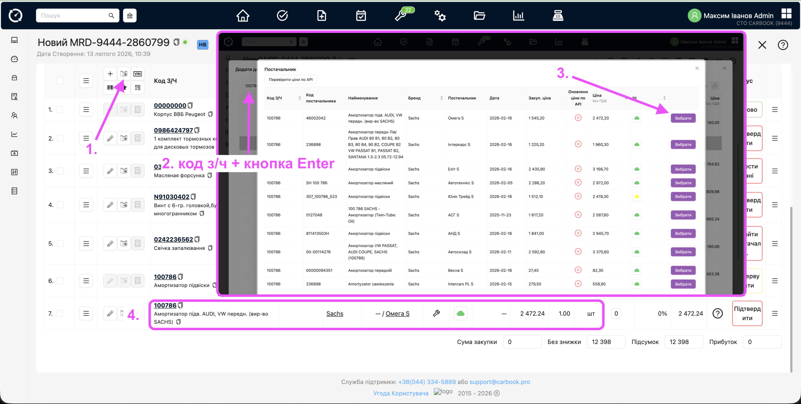 - Модальне вікно “Постачальники” при виборі в рядку товара від конкретного постчальника, забезпечено коректне відображення постачальника в модальному вікні “додавання/редагування” з/ч в н/з і подальше його додавання до табу “запчастини”.