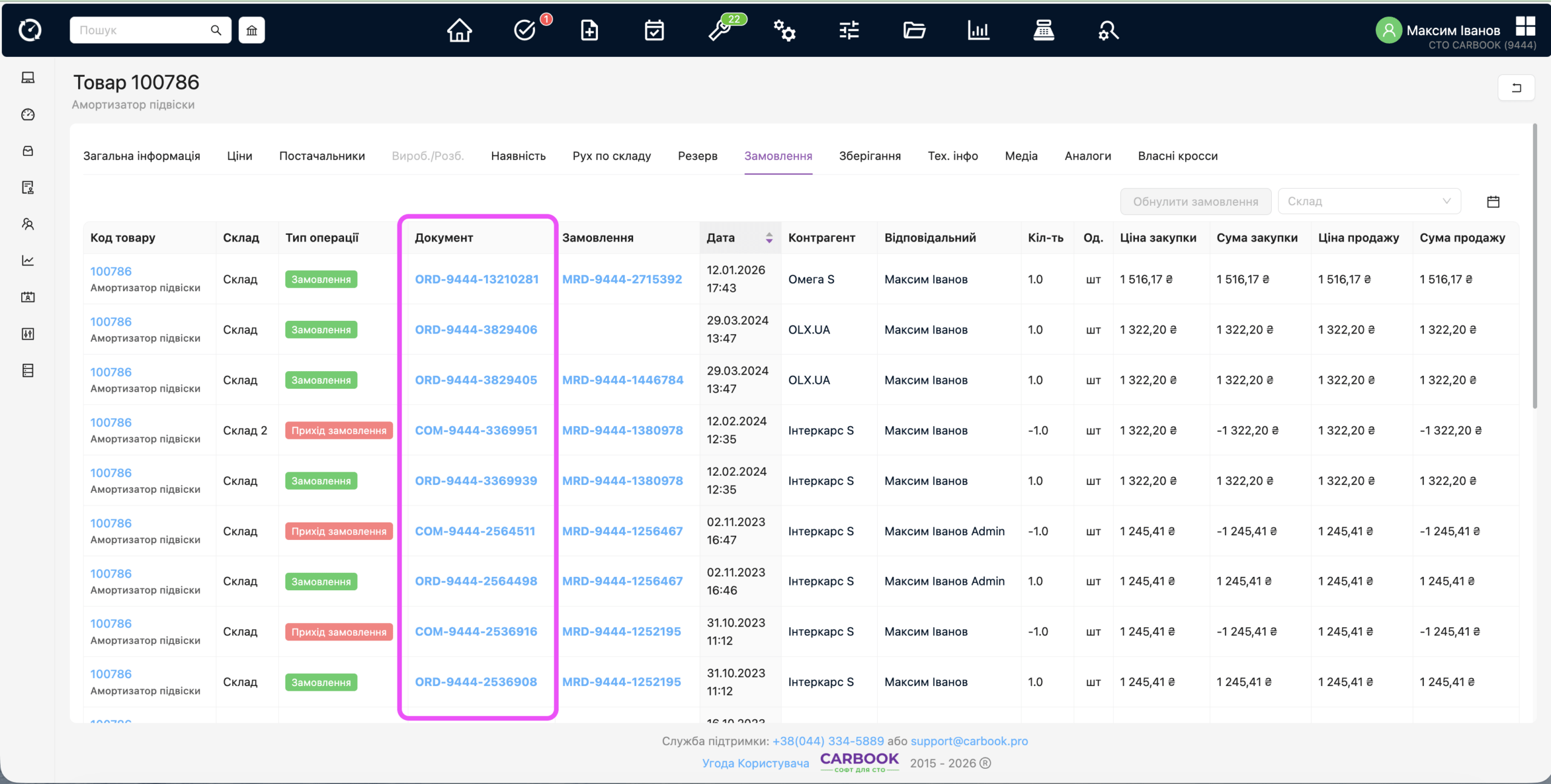 - Картка товару, вкладка «Замовлення постачальнику», в колонці «Документ» коректно відображається номер документа з посиланням на нього, для типів COM та ORD.