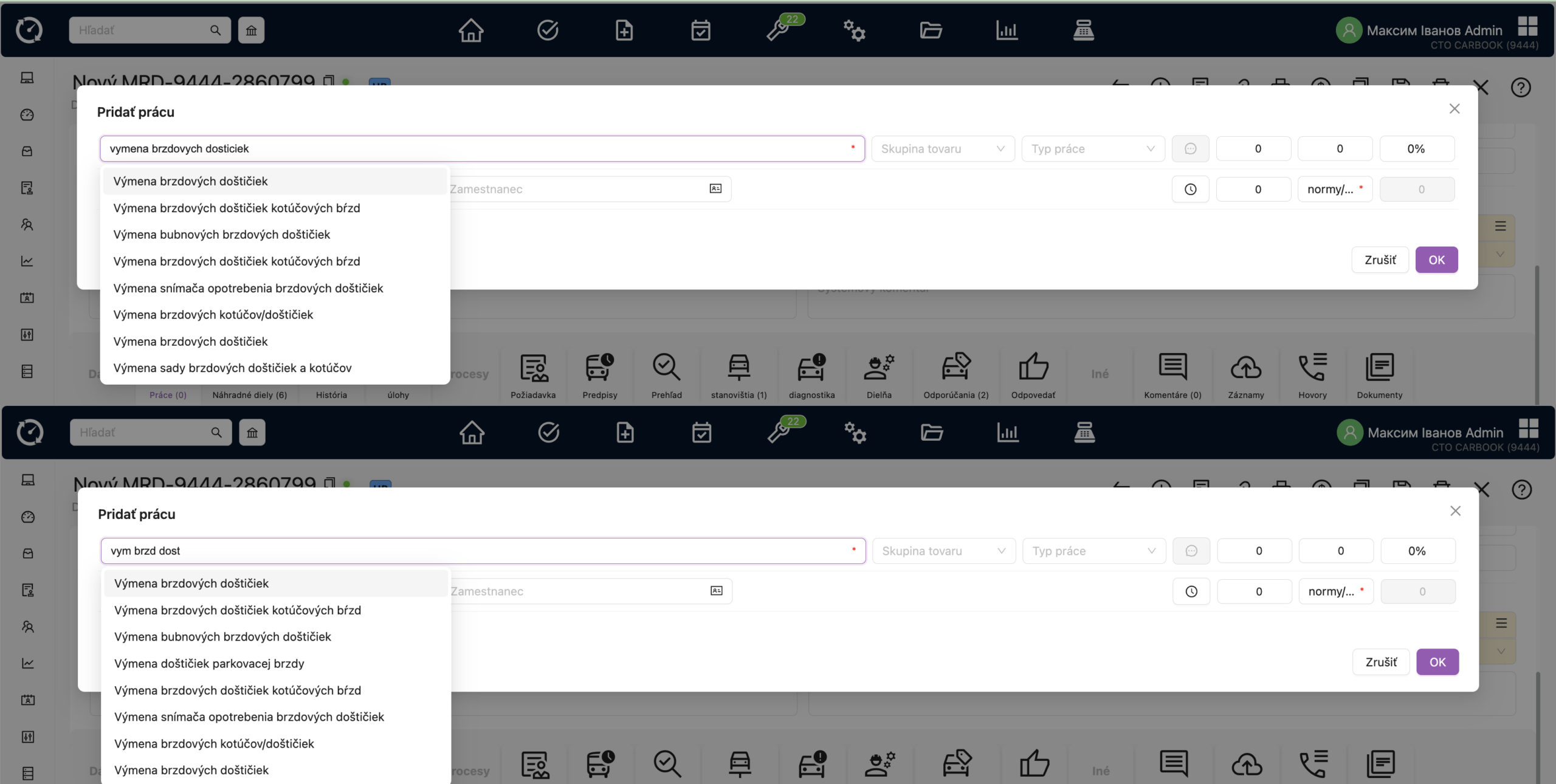 Якщо в системі для довідників і друкованих форм увімкнена “Словацька мова”, то у н/з → модалка додавання/редагування роботи → можна ввести “vymena brzdovych dosticiek” і система знайде: “výmena brzdových doštičiek” (відповідник українською — «заміна гальмівних колодок»).