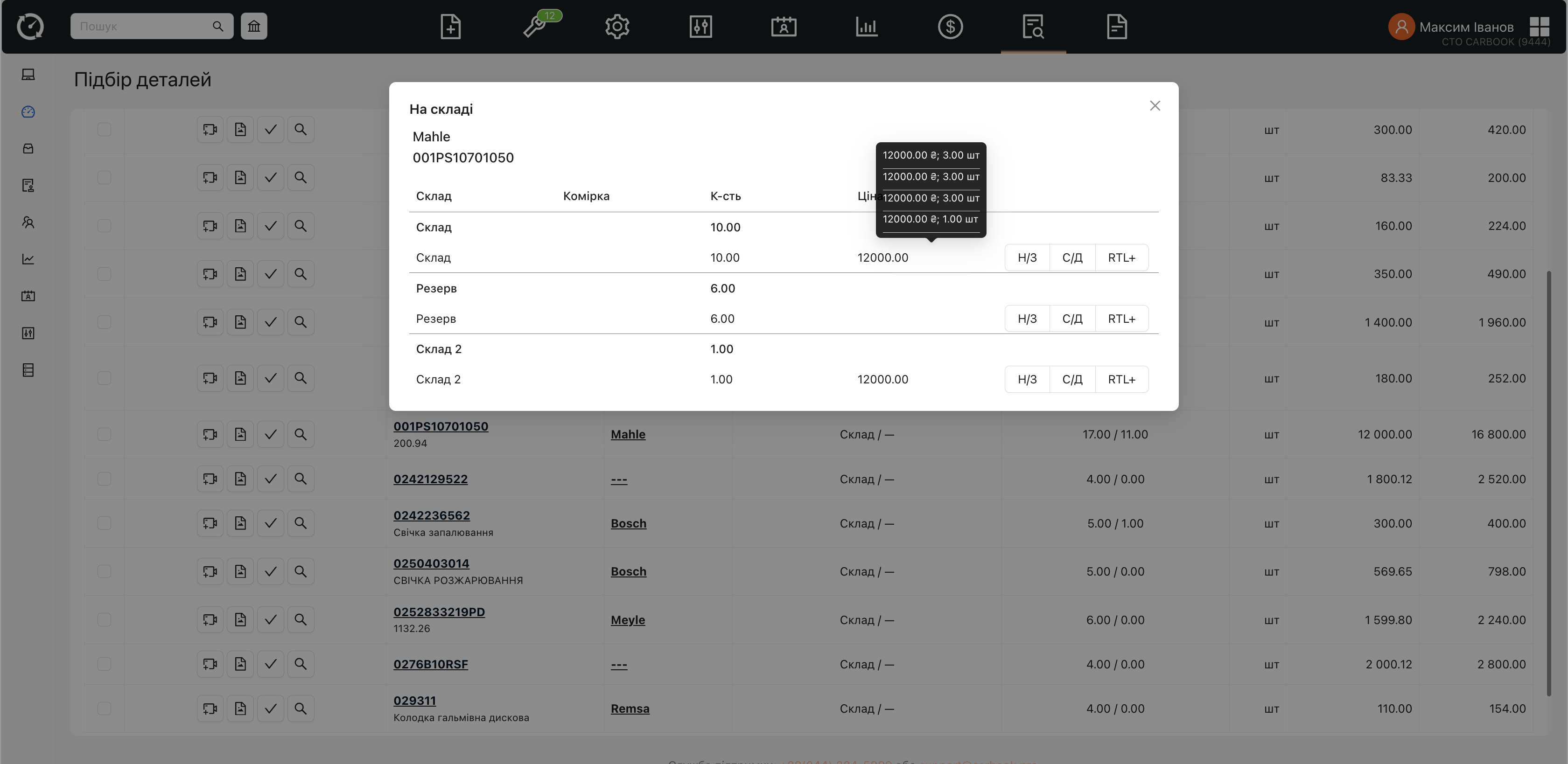 - Вікно “підбір деталей” – в рядку товару — при відкритті модалки наявність на складі — оновлена верстка — показ кількості, ціни та повідомлення про закупки.