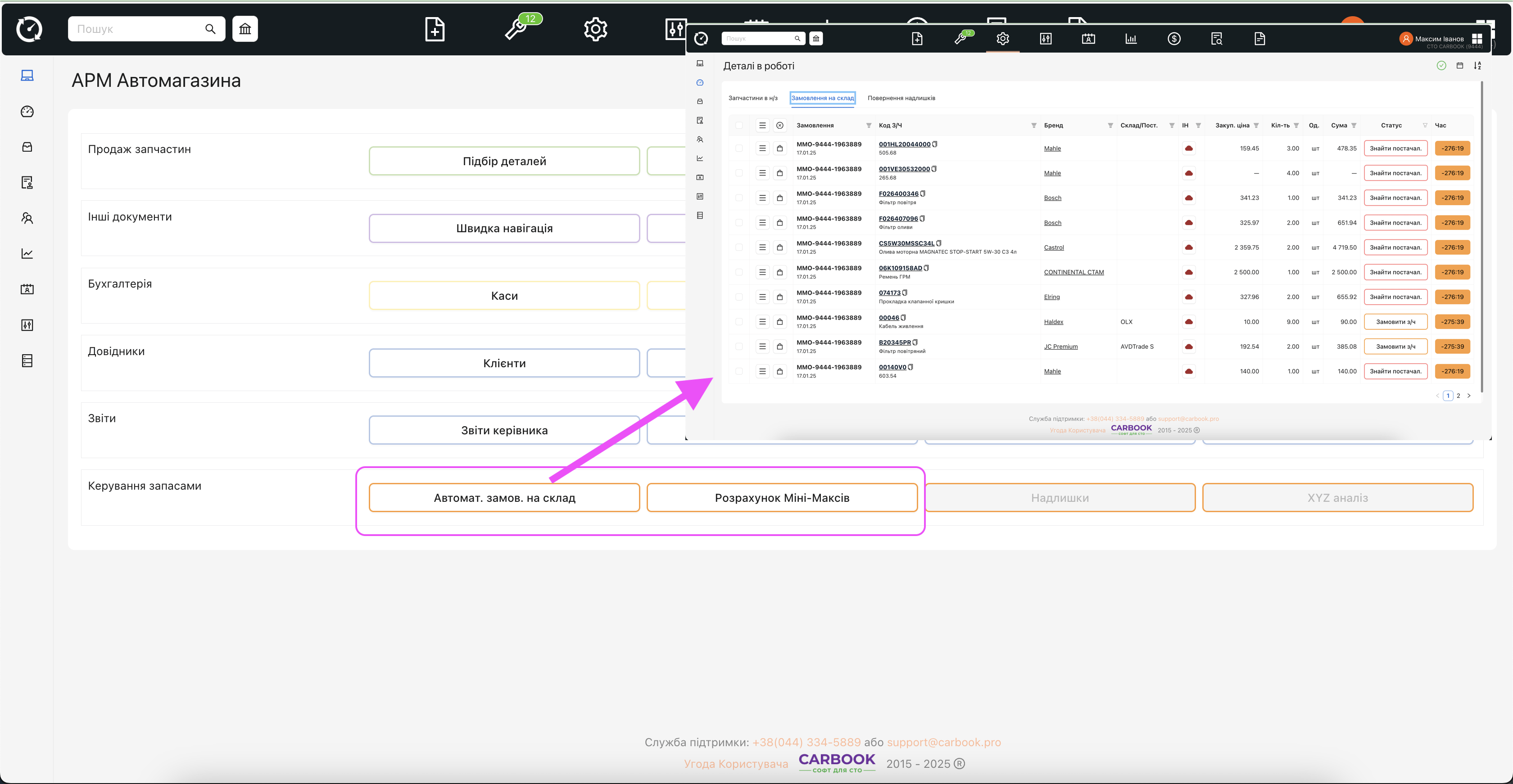 - Зроблено перехід “Замовлення по мін/макс” – на 2й таб. в “Деталі в роботі” та змінена назва кнопки “автоматичне замовлення на склад”.