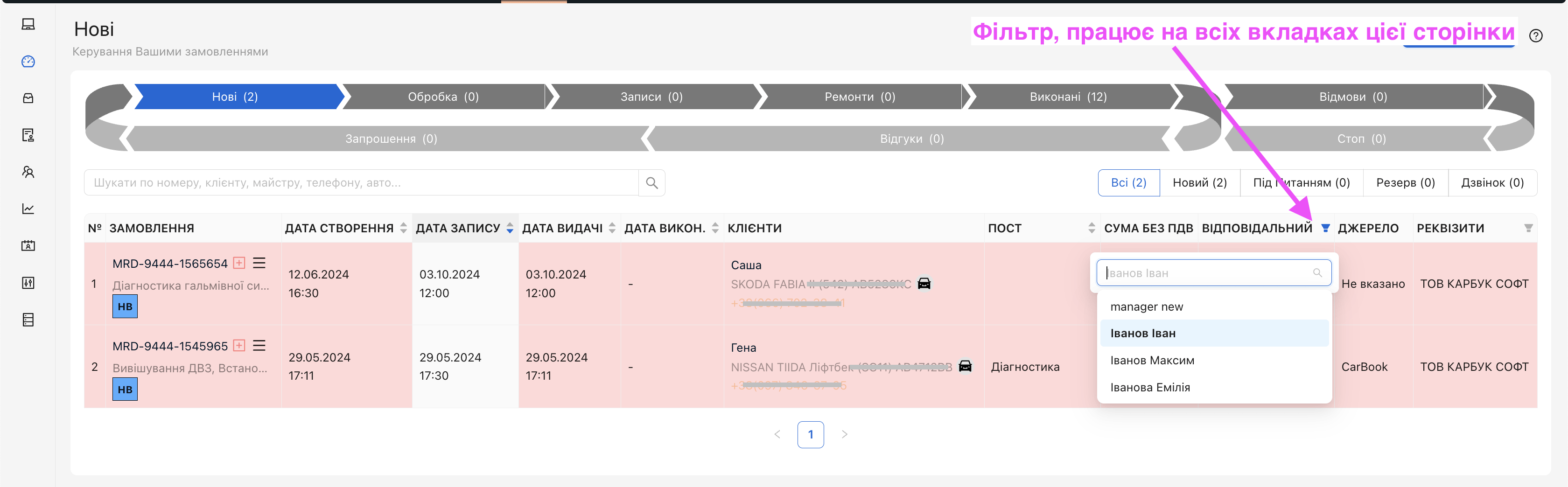 - Сторінка “Ремонти” – фільтр “Відповідальний” – при виборі фіксується, не залежно від перегляду різних табів цієї сторінки.
