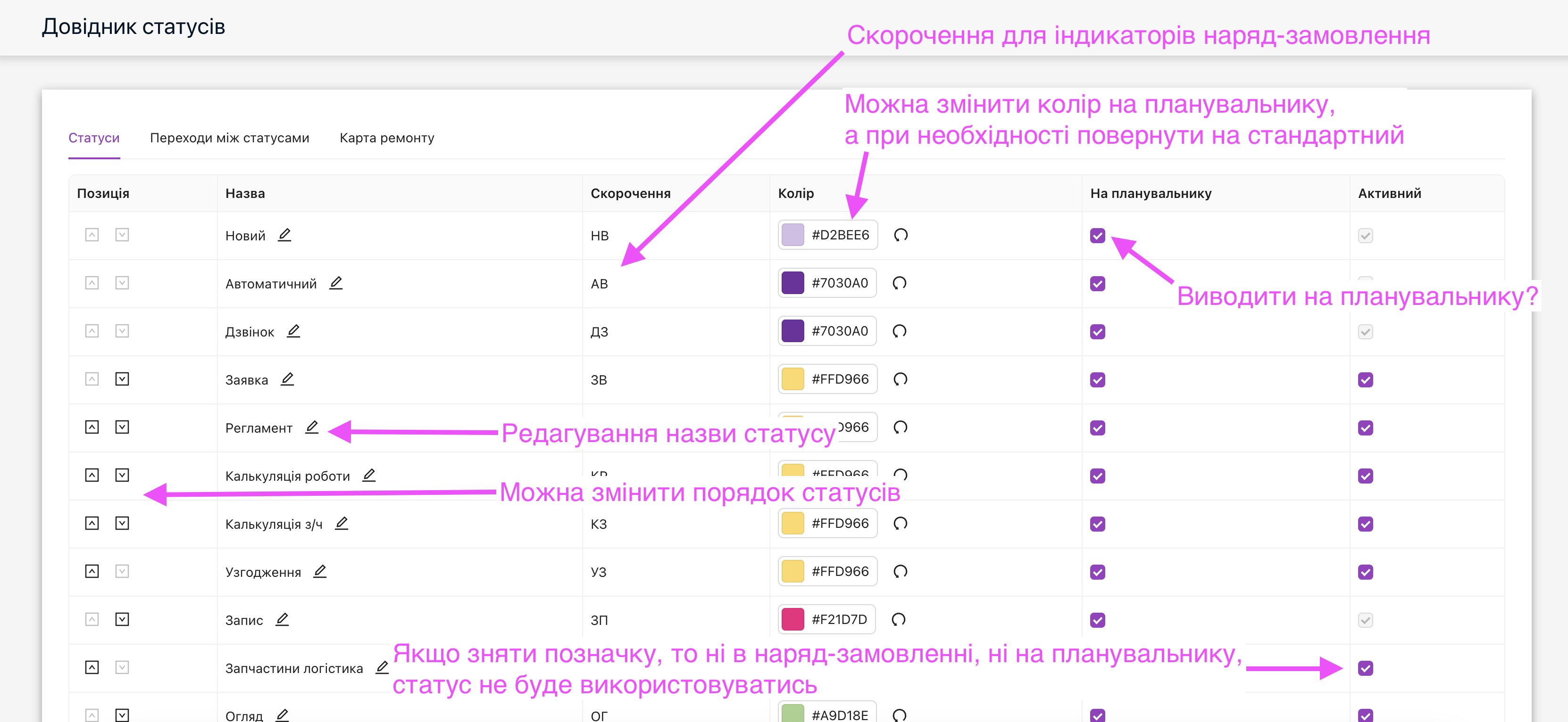 Статуси та індикатори на цій ілюстрації, можна прибирати та додавати, наприклад, якщо вам не потрібен статус “Запчастини логістика” або “ЗЛ”, то можете його прибрати в налаштуваннях. Для цього перейдіть в “Довідники та налаштування” та оберіть – “Довідник статусів“.