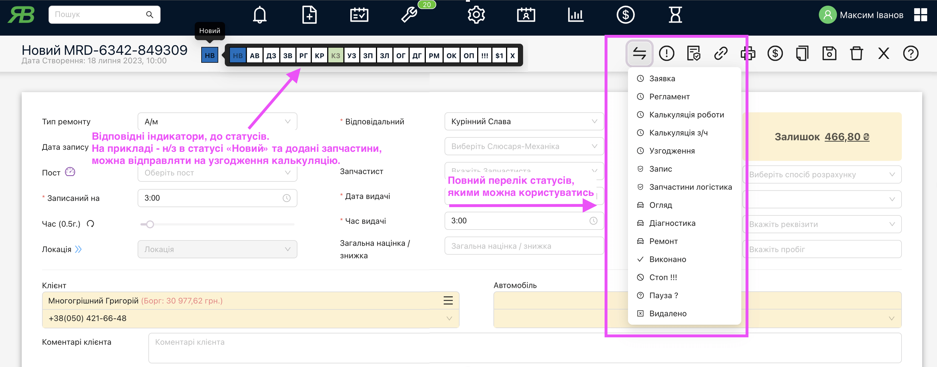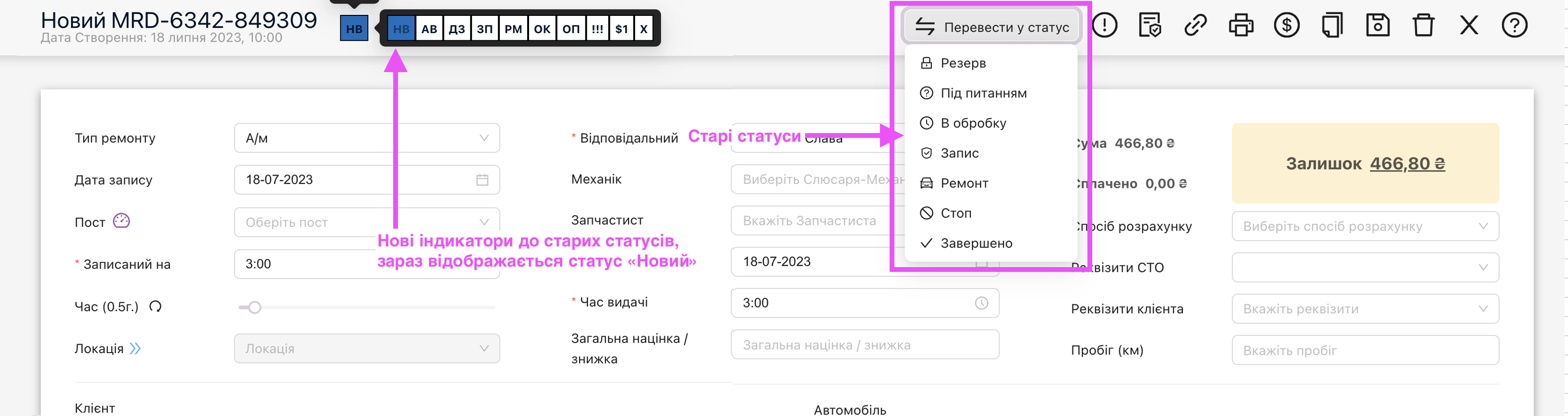 Після цього в наряд-замовленнях та на планувальнику будуть відображатись інші статуси та індикатори. Ось так працюють старі статуси й нові індикатори до них. Зараз, на прикладі, наряд-замовлення в статусі “Новий” і це видно синім кольором на індикаторі, а також є можливість змінити статус на один із запропонованих. Тепер тут є “Стоп” – це для тих моментів, коли роботу тимчасово неможливо завершити зараз, наприклад, немає з/ч.