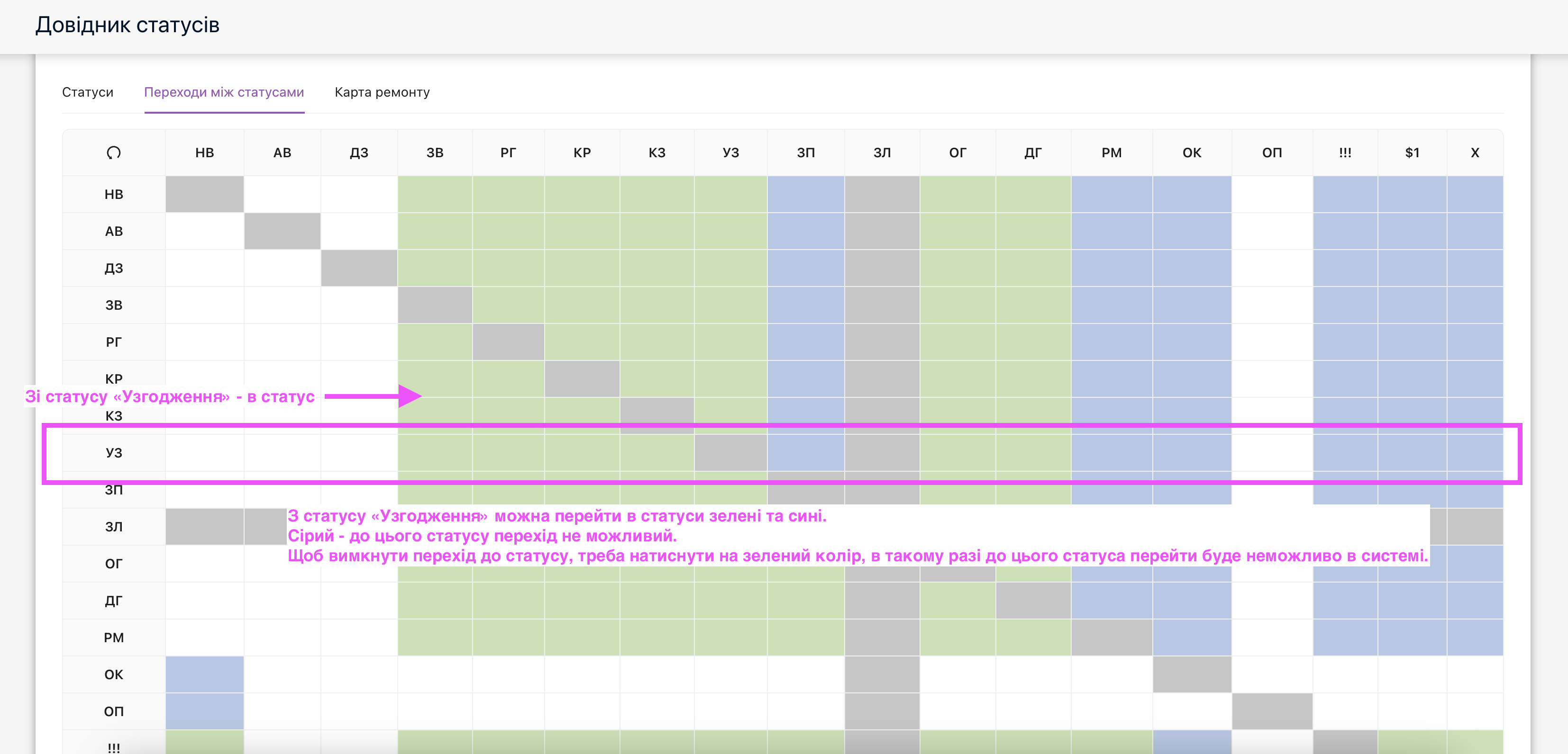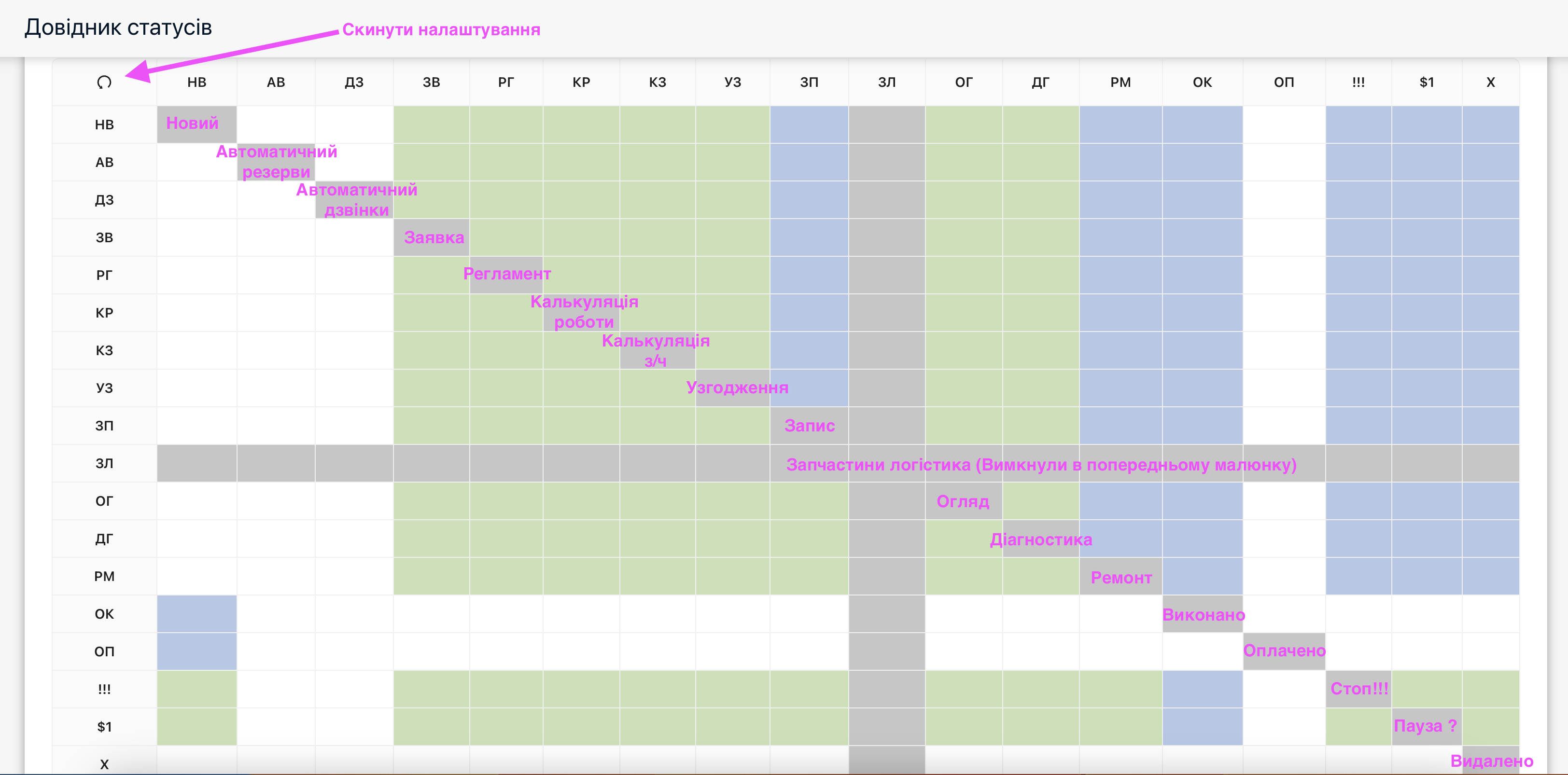 Таким чином, можна зробити систему, для свого СТО такою, якою вона буде відповідати вашим потребам. Потрібен статус — увімкнули, треба змінити імʼя, теж доступно. Але ще є окреме налаштування, у наступній вкладці — це гнучка логіка переходів між статусами, з якого статусу можна перейти до інших. Тут можна вмикати або вимикати можливість переходів між статусами. Логіка наступна — лівий стовпчик — значить з якого статусу можна переходити, а праворуч до якого можна перейти. Сірий колір — перехід неможливий системно, Синій колір — неможливо вимкнути перехід. Зелений — дозволений перехід, але можна вимкнути, тоді буде неможливим перейти до цього статусу.