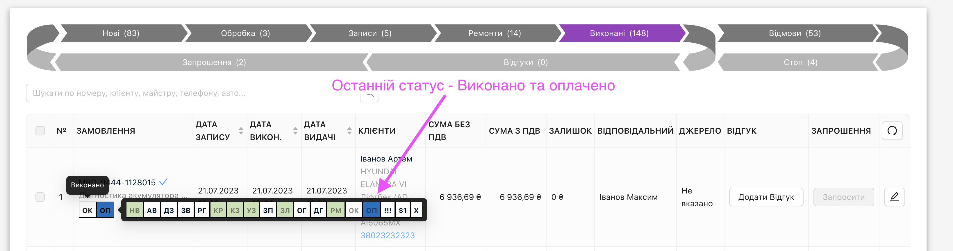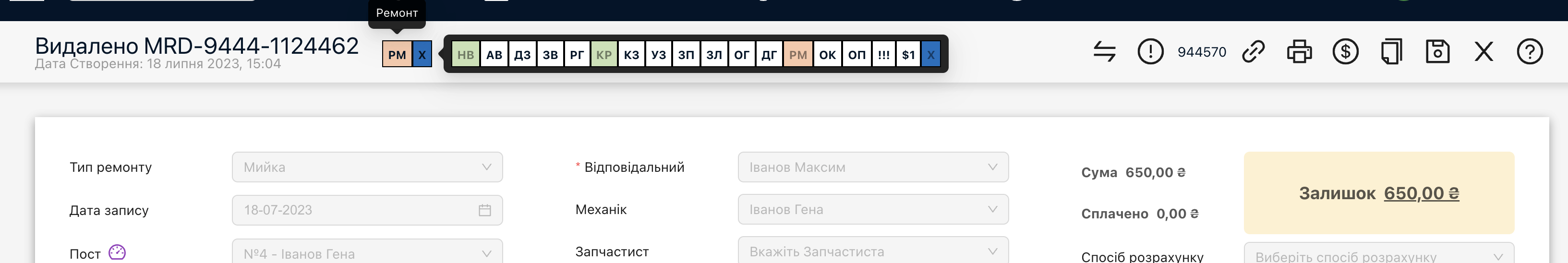 Таким чином, глянувши на статус, можна відразу побачити, яка дія була попередньою. Ми бачимо з цього зображення, що наряд-замовлення було нове, в нього були додані роботи, і переведено в статус “Ремонт”. Але потім з якихось. причин видалено це наряд-замовлення, без сплати та закриття.