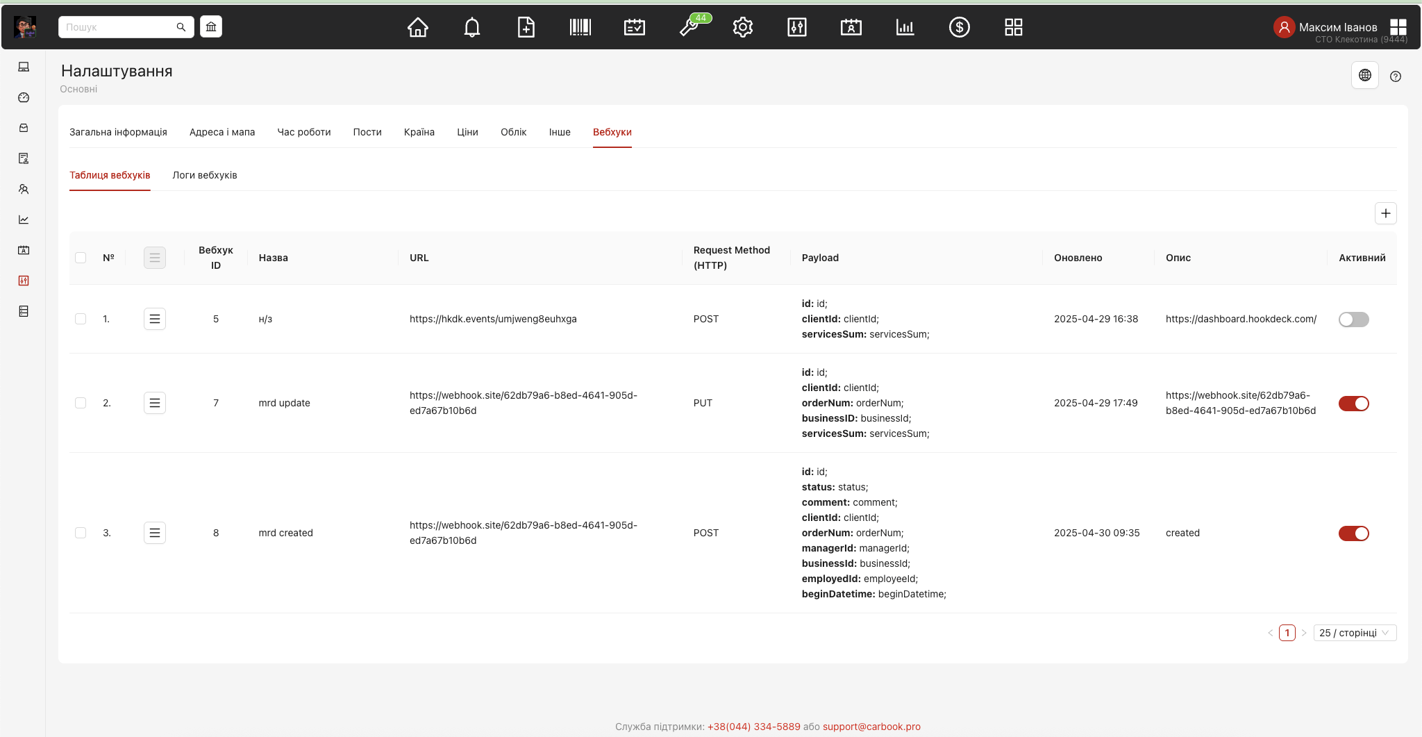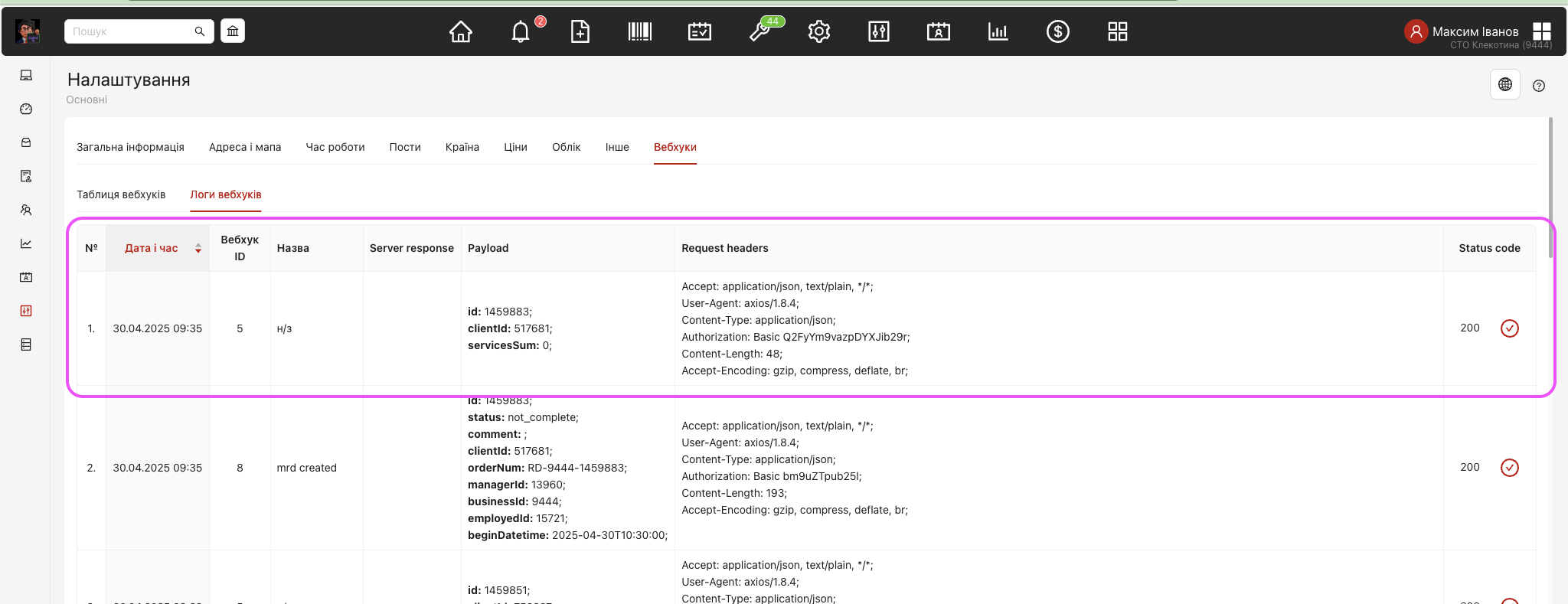 “Налаштування СТО” – таб “Вебхуки” – “Логи вебхуків”. Приклад тестування нового доданого вебхука.