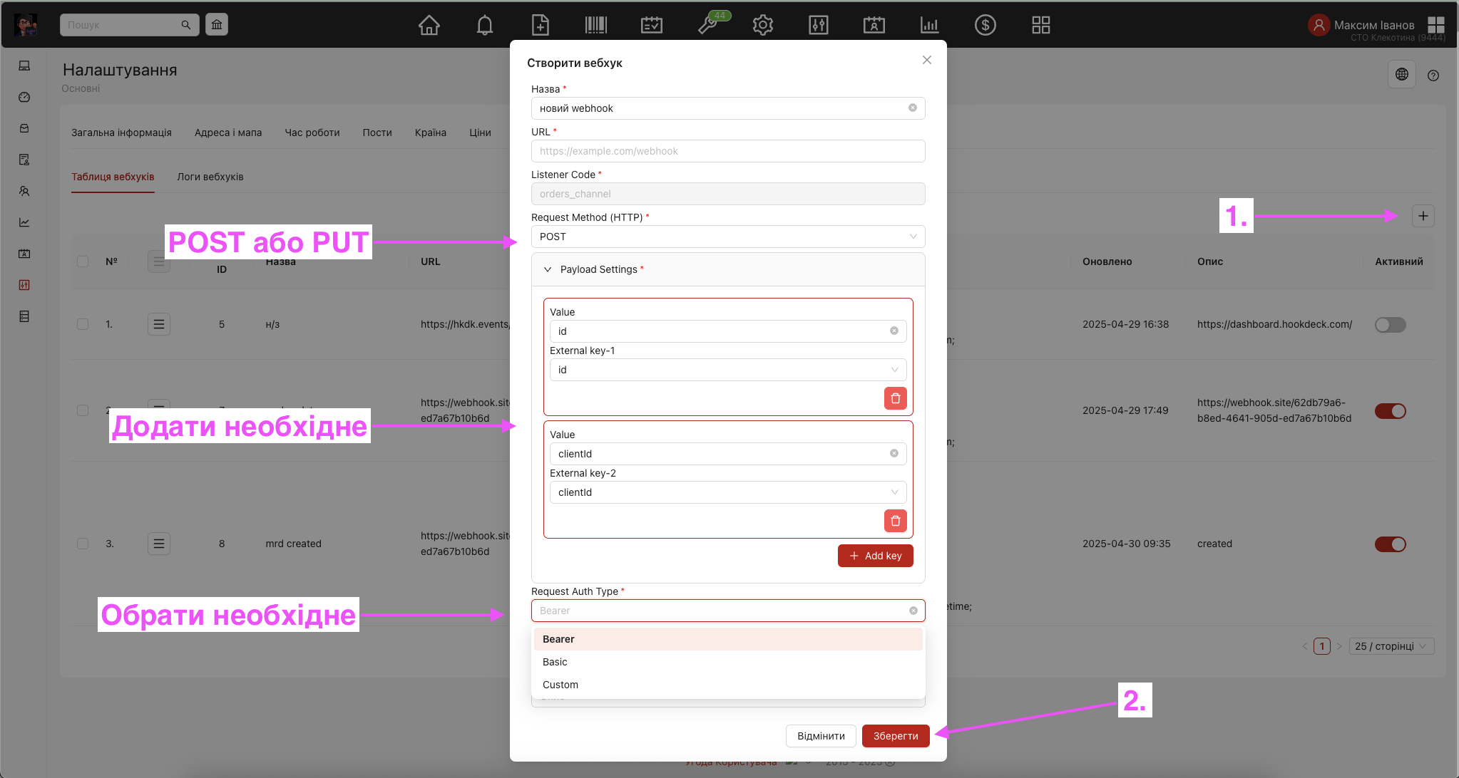 Для створення нового вебхука, треба скористатись кнопкою “плюс” в правому верхньому куті. Заповніть необхідні поля та збережіть. Нижче є опис всіх можливих полів, які можна передати через вебхук. Доступно для авторизації: Bearer, Basic та Custom.