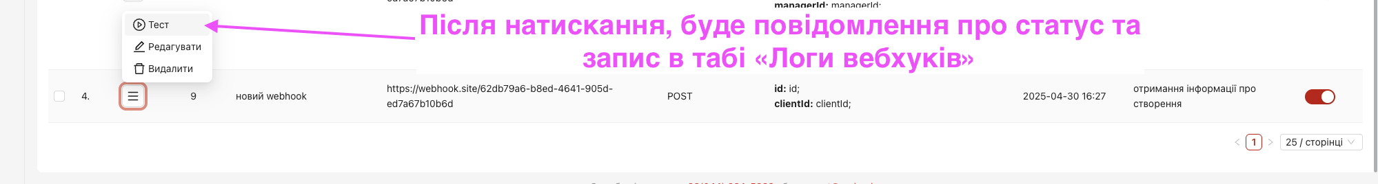 В таблиці вебхуків можливо додати вебхук, редагувати його, та протестувати перед роботою, видалити чи активувати/деактивувати – для цього є необхідні опції в меню бургер в кожному рядку.